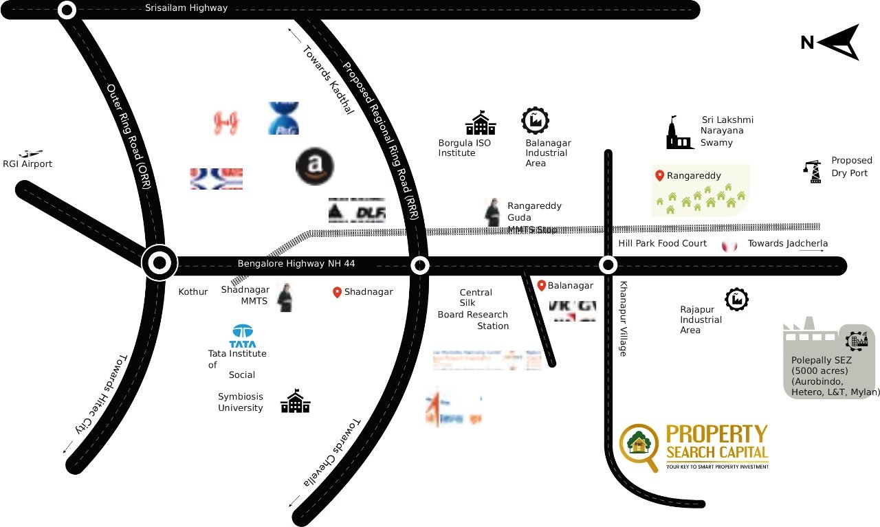 Just 10 minutes from Shadnagar, with quick access to NH44 Hyderabad–Bengaluru Highway, Srisailam Highway, RGI Airport, ORR, and the upcoming Regional Ring Road (RRR). Close to major economic hubs like Polepally SEZ, Rajapur SEZ, Amazon Fulfillment Centre, and key institutions including Tata Institute of Social Sciences.
